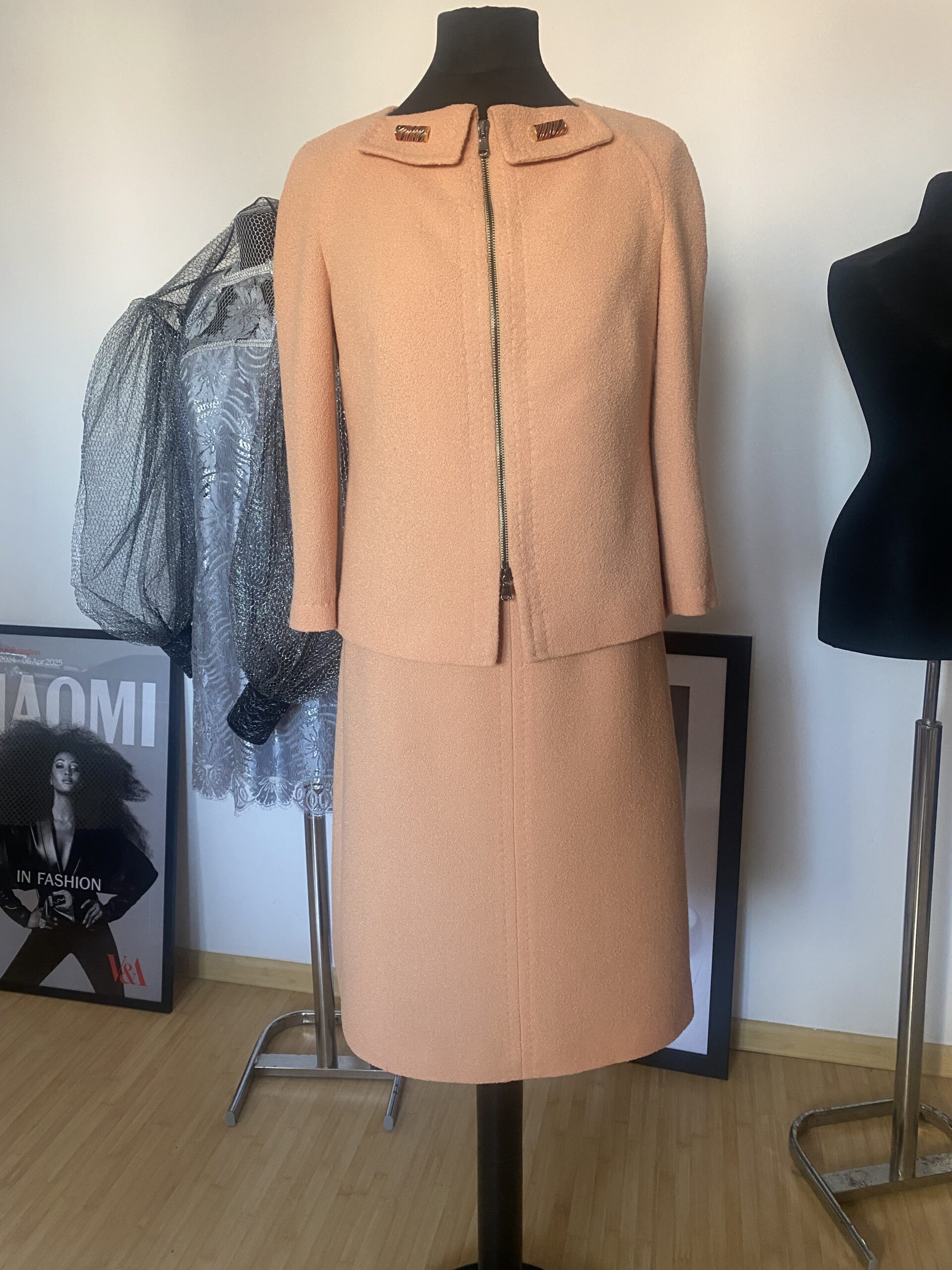 -costum elegant din stofa de burete de lana cu fusta usor evazata si jacheta cu fermoar si guler clape cu nasturi bijuterie, email gold plated