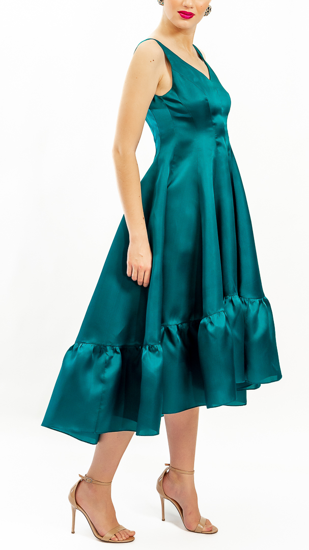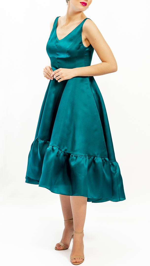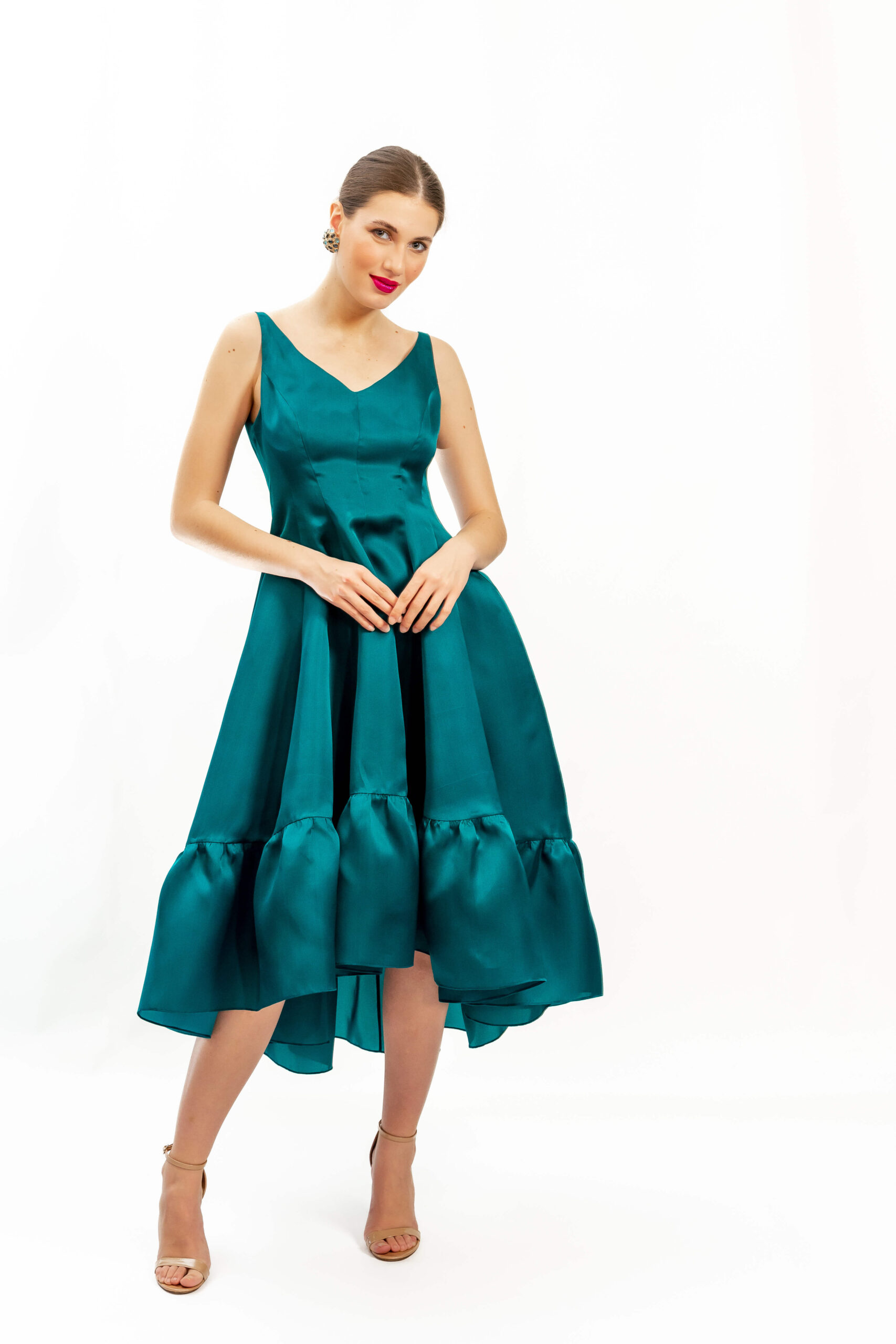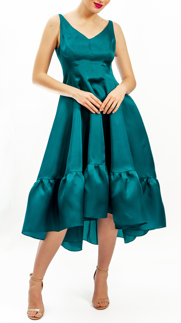 Rochie confecționată din organza dublă de mătase naturală, cu dublură de mătase naturală, cu croiala în clini si volan asimetric. Decolteul senzual, accentuează feminitatea, conferind dinamism și exuberanță!