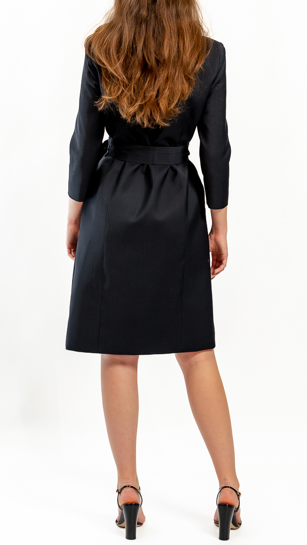 Rochie sacou din stofă premium, subțire, termocolată, cu dungi fine, abia perceptibile, tăiată în talie, cutată, cordon legat cu fundă în talie, guler cu rever, mânecă trei sferturi.