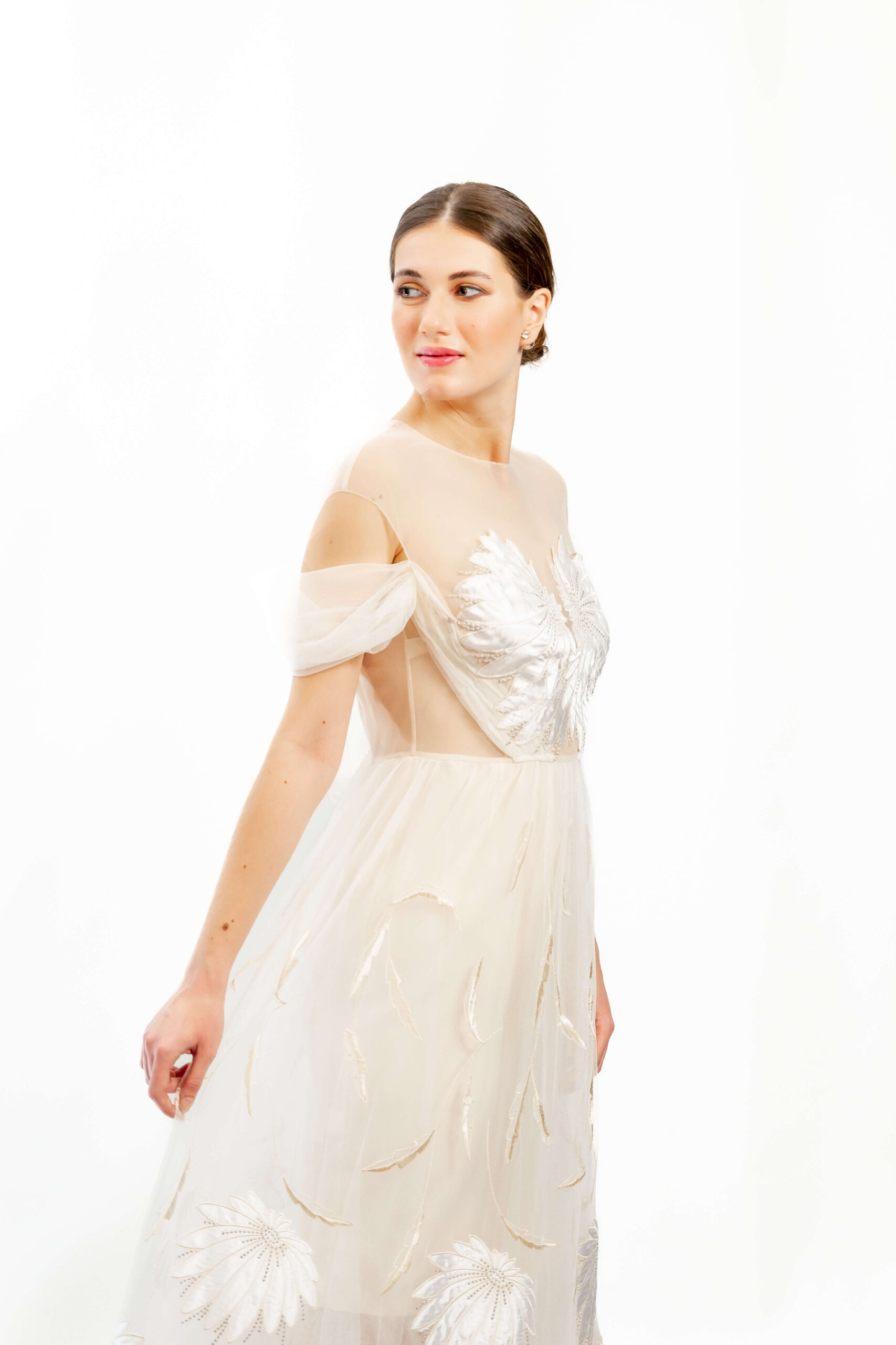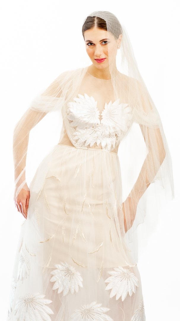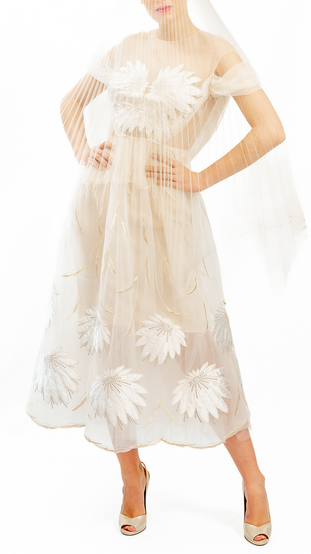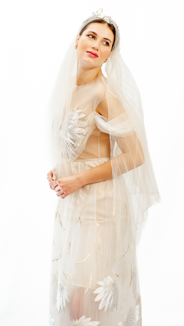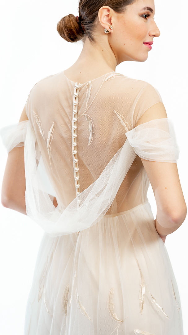 Rochie diafană de cununie, executată din tul de poliamidă, broderie cu satin de mătase naturală pe tul – țesături de calitate haute couture.