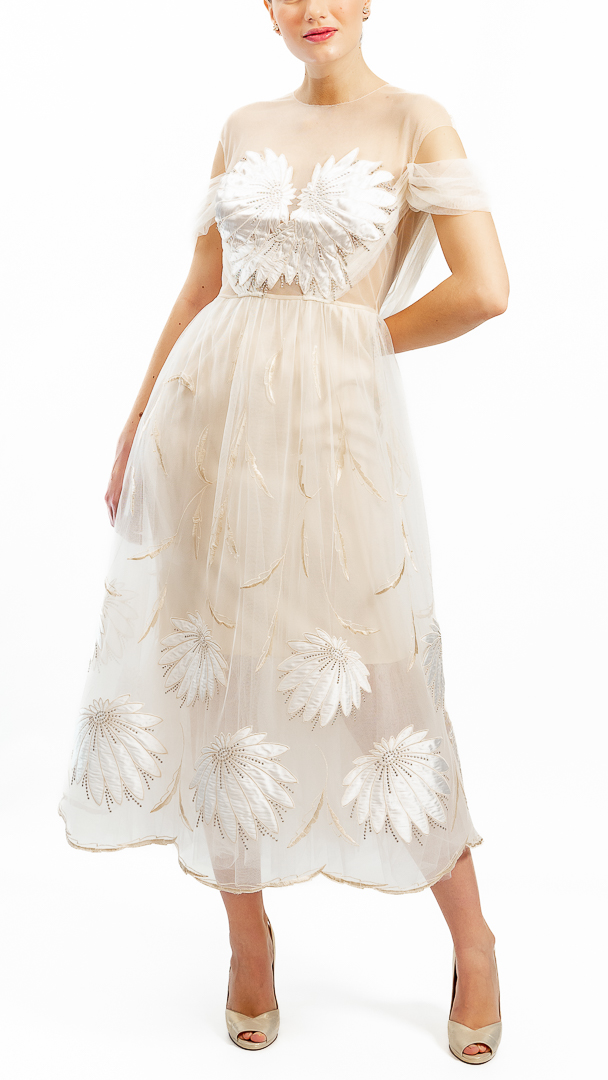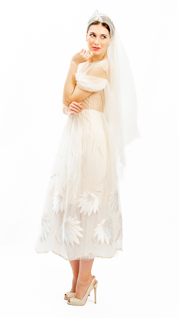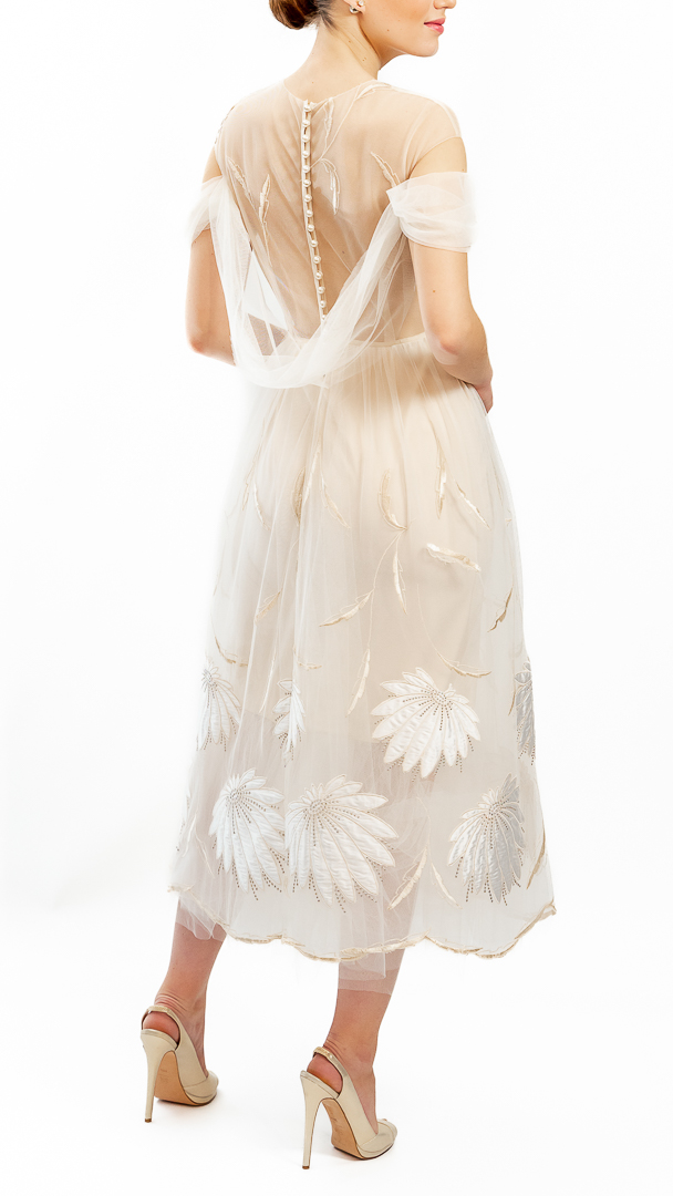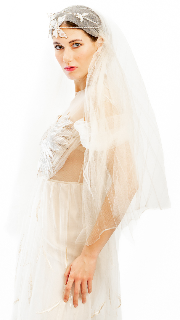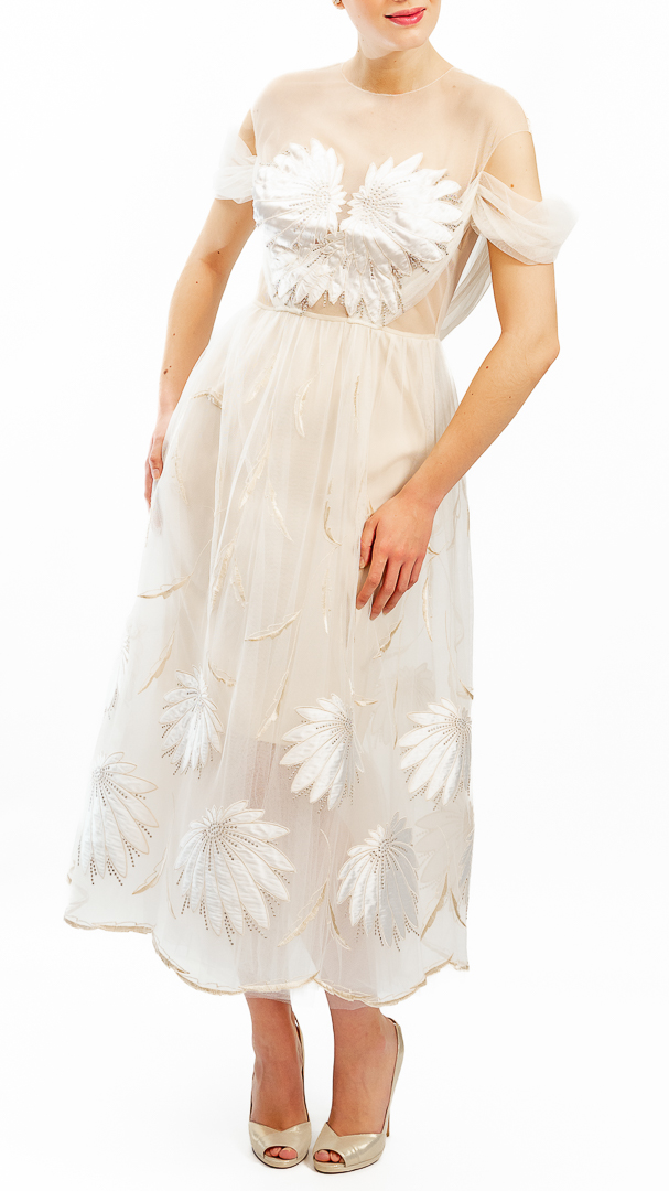 Rochie diafană de cununie, executată din tul de poliamidă, broderie cu satin de mătase naturală pe tul – țesături de calitate haute couture.