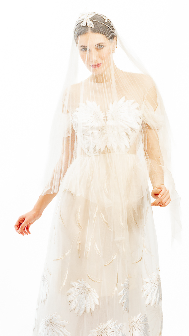 Rochia de cununie poate fi accesorizată cu un voal cu pliseuri soleil, confecționat din tul de mătase naturală, cu efect subtil de raze solare care încălzesc și iluminează.