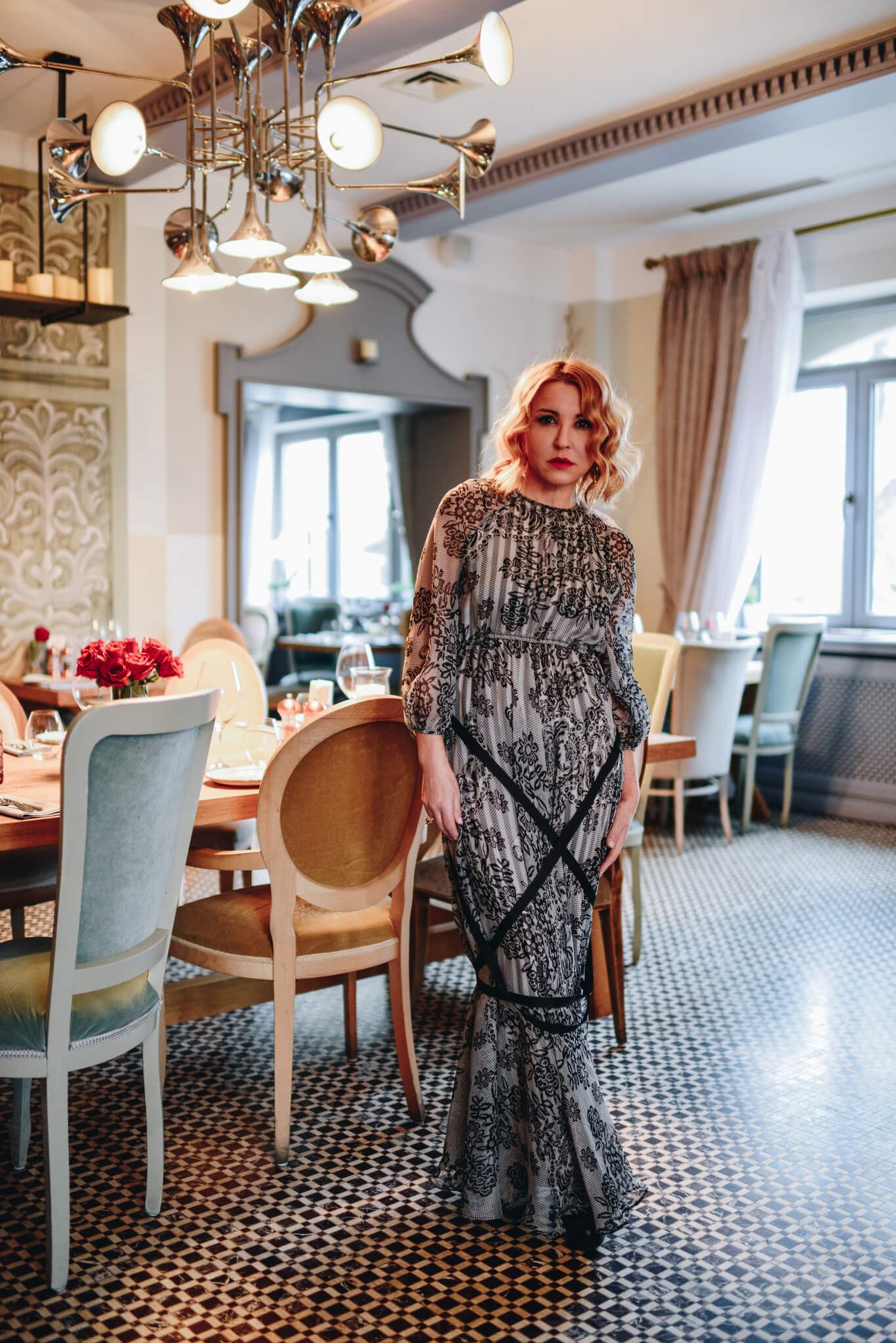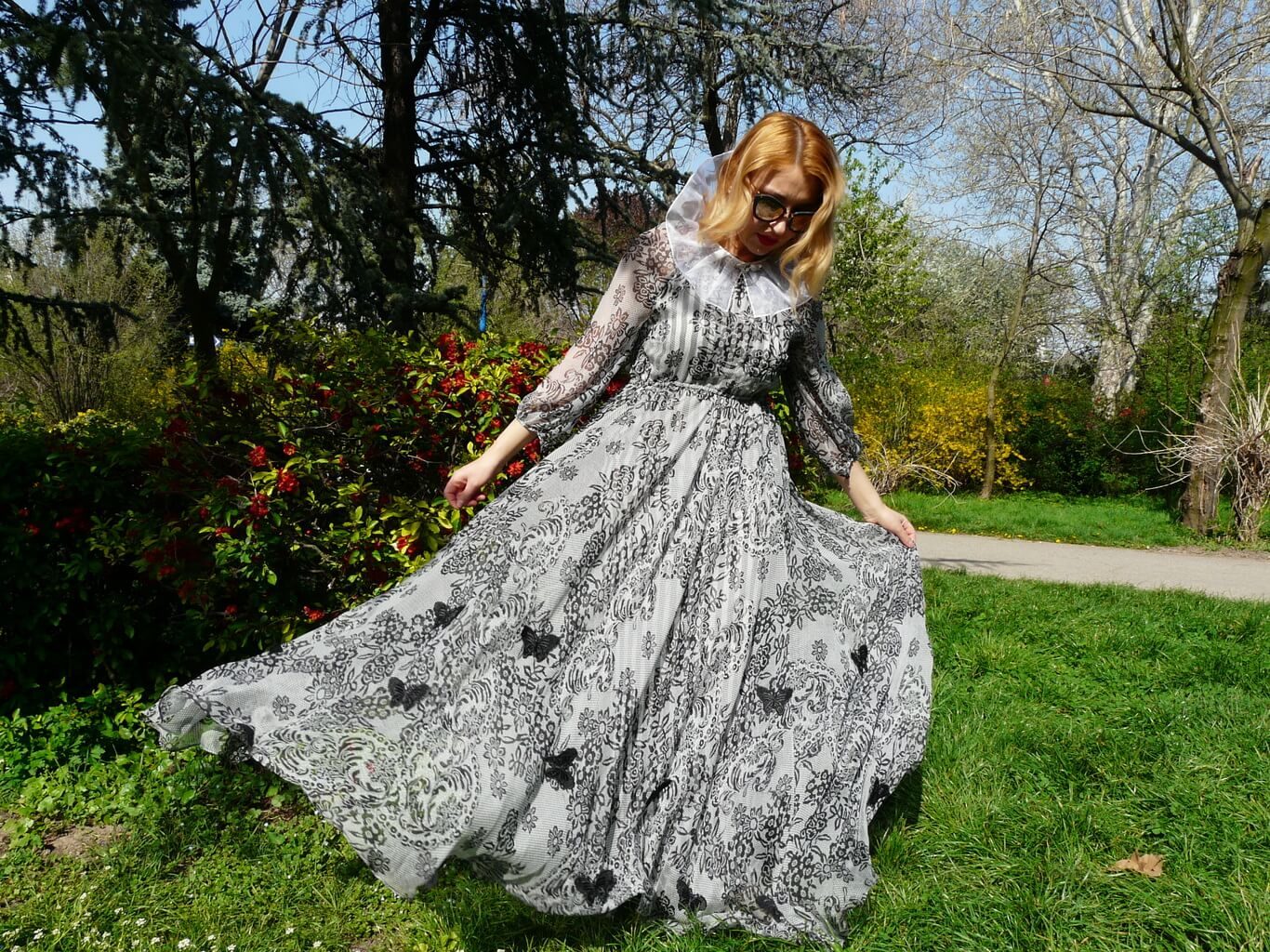 Rochie din voal de matase naturala si dublura din matase naturala, accesorizata cu cordon din rips, guler sau jabou din organza de matase naturala.