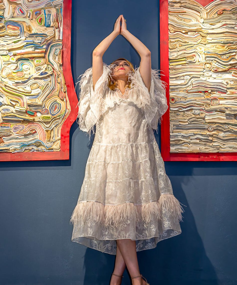 Rochie din muselina de matase brodata si furou detasabil din matase naturala.